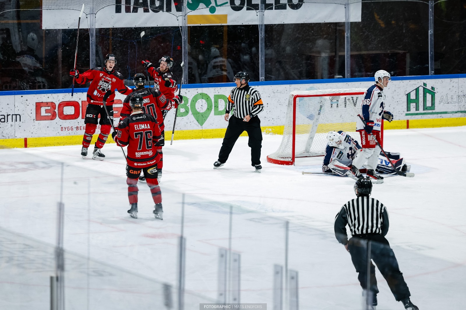 Om vi tänker tillbaka till lördagens match och fokuserar på starten som var lite seg från Bodens håll – ja då var dagens matchstart raka motsatsen. Tekningsgiganten Christian Nyman tog hem första tekningen och redan där startade den massiva pressen från hemmalaget. Boden kunde etablera tryck i offensiv zon rätt direkt och gästande Surahammar kunde bara mäkta med att slå ifrån. Denna press skulle också komma att ge resultat då hemmalaget kunde ta ledningen efter ynka 1,35 minut. Detta efter att Erik Hannu hittat passningen till backkollegan Vigor Andersson som elegant kunde trycka in pucken i nät från blålinjen. Vigor Andersson som varit en otroligt viktig kugge i lagbygget fick i och med detta även göra sitt första mål i Bodentröjan.