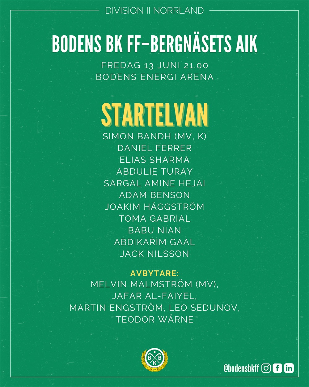 Kvällens startelva i hemmamatchen mot Bergnäsets AIK.