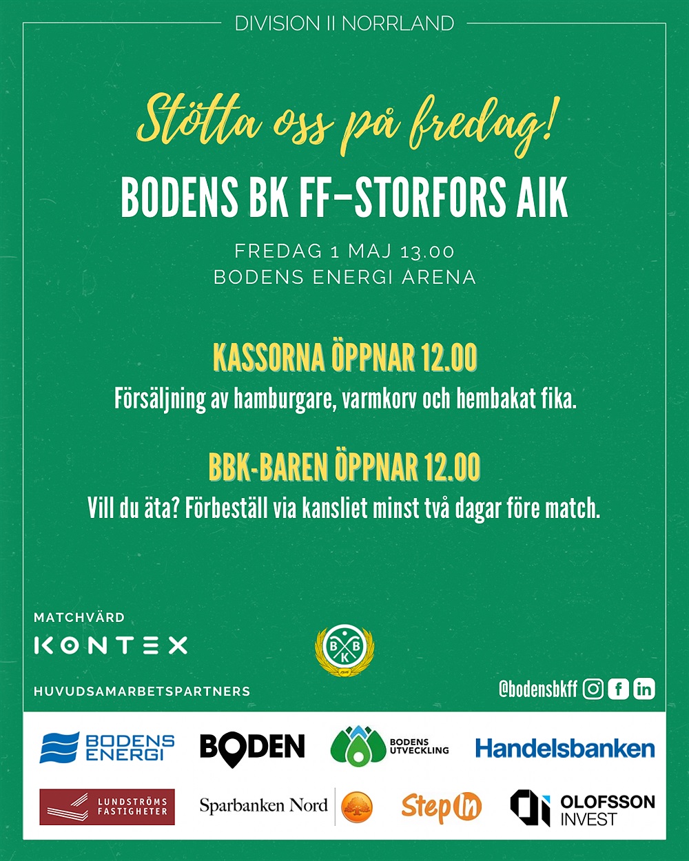 Hem Locals - BBK Fotboll Hemmamatch på fredag! Locals- BBK FotbollLocal NewsSport Hemmamatch på fredag! Av bbkfotboll - 2026-04-28 Avspark 13.00. ———————————————————– Klicka här – länk till originalinlägget Källa: BBK Fotboll ———————————————————– RELATERADE ARTIKLARMER FRÅN SKRIBENTEN - BBK Fotboll BBK FF vidare i Stora Coop Norrbotten Cup efter 2-0 (0-0) mot BAIK - BBK Fotboll Startelvan mot Bergnäsets AIK - Boden Handboll Säsongen är över – Boden Handboll