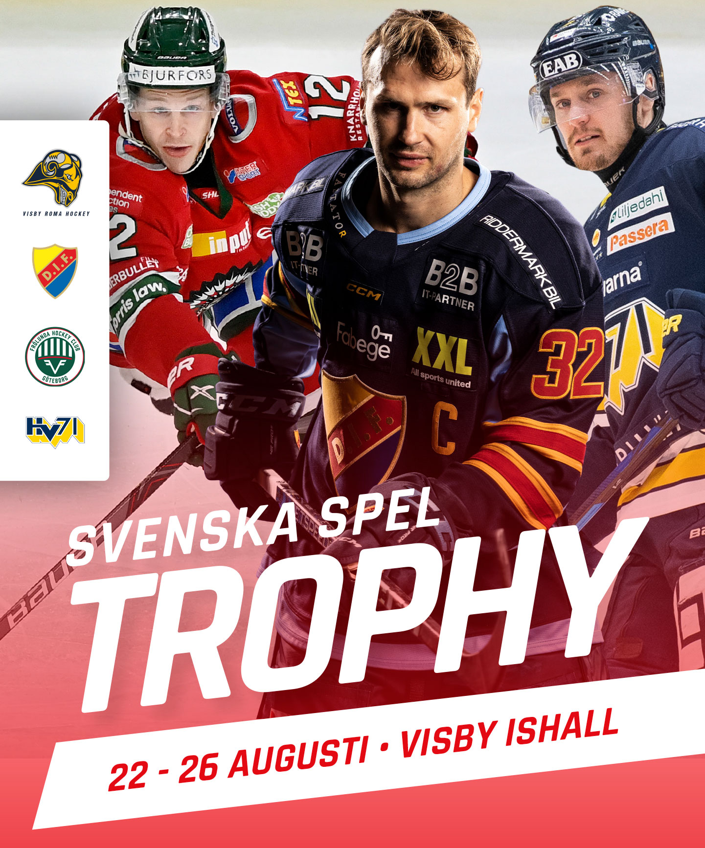 Visby Roma Hockey är glada att kunna presentera årets upplaga av Svenska Spel Trophy. Deltagande lag är liksom premiäråret Frölunda, Visby Roma och Djurgården. Nytt för i år är att vi även hälsar Hv71 varmt välkomna till turneringen som spelas i Visby Ishall mellan 22-26 augusti. Biljetterna till turneringen släpps idag torsdag 25 aug kl 11.00 på länken nedan.