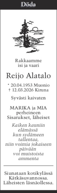 Annonser- DödsannonsBegravningsbyråerBB Granmyrs BegravningsbyråOrtKiruna Reijo Alatalo Av redaktiongt - 2026-04-09 FacebookTwitterPinterestWhatsApp