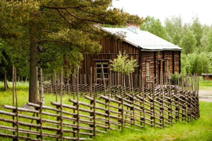 fasaden ett ålderdomligt utseende. Inuti är det däremot inrett som en norrbottnisk bondgård från början av 1920-talet, med blommiga tapeter och målad väggpanel.