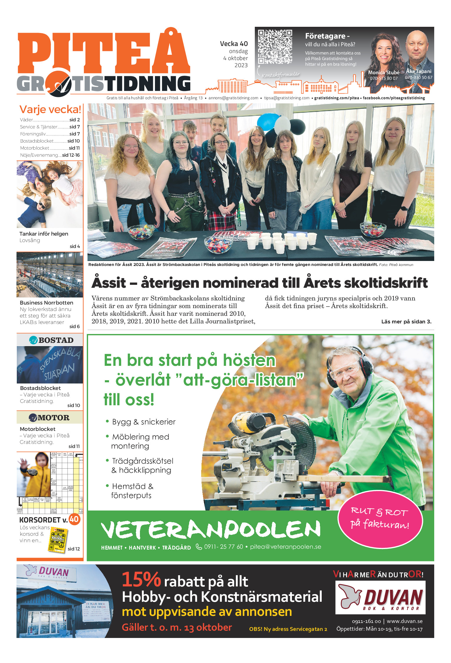 Hem E-tidning Piteå Gratistidning (vecka 40, 2023) E-tidning Piteå Gratistidning (vecka 40, 2023) Av redaktionpitea - 2023-10-04 Klicka här! om inte E-tidningen visas nedan. RELATERADE ARTIKLARMER FRÅN SKRIBENTEN E-tidning Piteå Gratistidning (vecka 17, 2026) E-tidning Piteå Gratistidning (vecka 16, 2026) E-tidning Piteå Gratistidning (vecka 15, 2026)