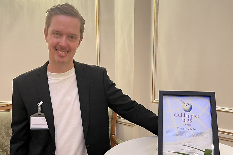 David Svanholm, som är lärare på Dragonskolans Teknikprogram, har vunnit första priset i Guldäpplet. Det är en professionsutmärkelse för lärare som förnyat undervisningen och arbetat med digitala verktyg och arbetsformer.