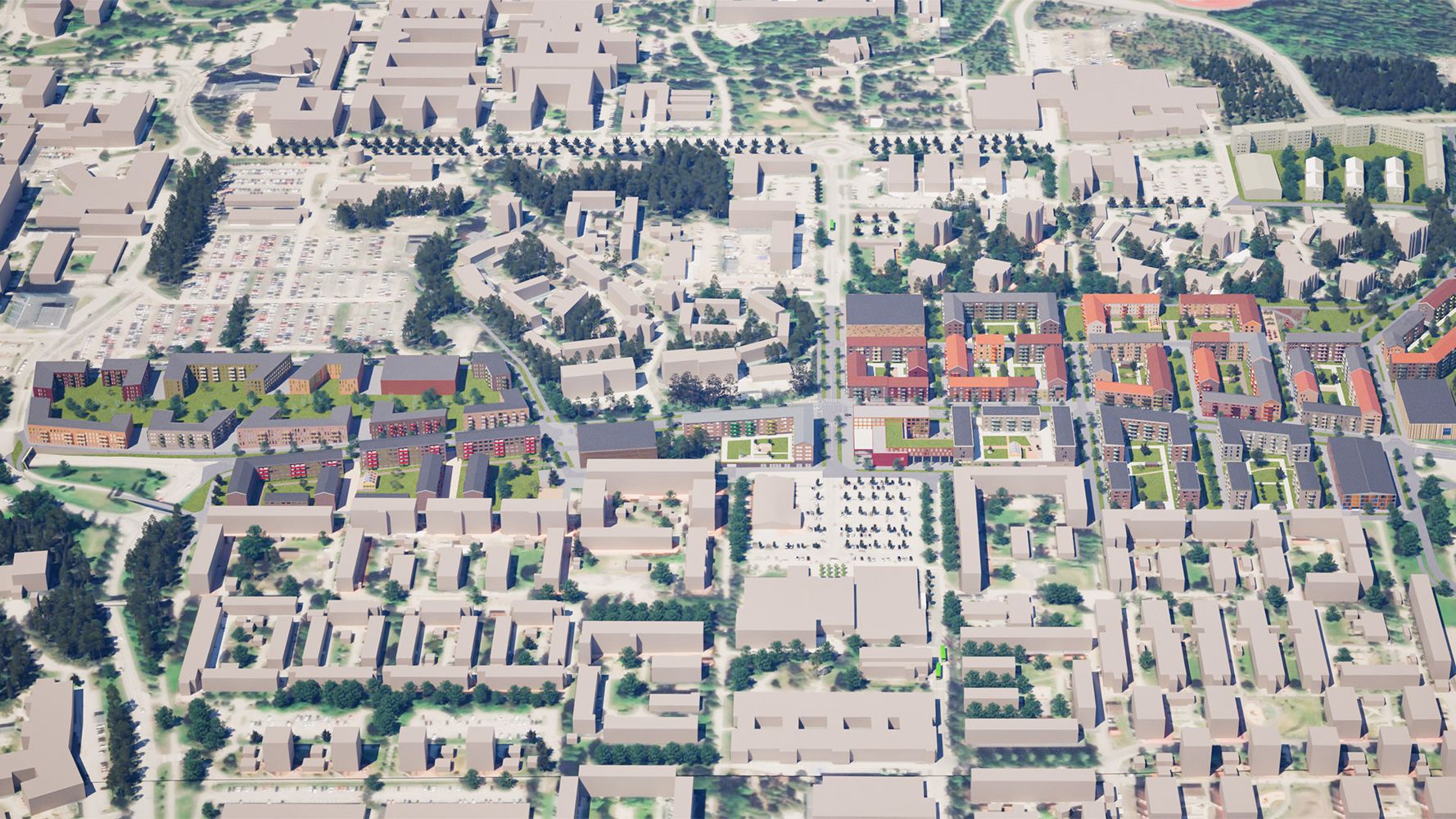 Den föreslagna kvartersstaden ramar in den nya stadsgatan och ger området en tydligare struktur. Bebyggelsen i 4–6 våningar placeras för att skapa trygga gaturum och gröna, skyddade gårdar. Totalt visar planprogrammet att området kan rymma upp till cirka 2 000 bostäder, tillsammans med lokaler i bottenvåningar för service, utbildning och kultur.