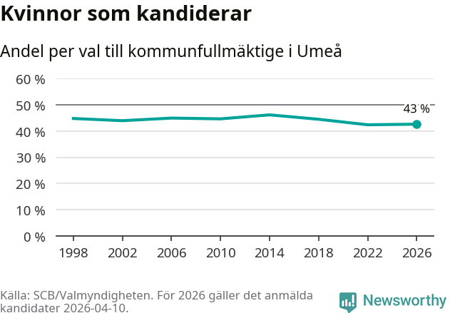 Kvinnorna utgör 43 procent av de hittills anmälda kandidaterna. Vid valet 2014 var 46 procent kvinnor, valet 2022 var motsvarande siffra 42 procent. Umeå är en av 264 kommuner i landet där männen utgör en majoritet av kandidaterna på listorna.