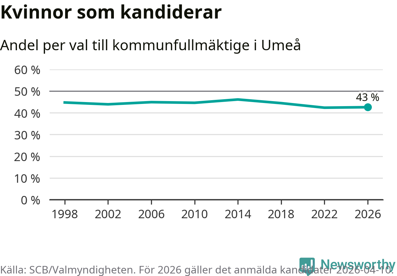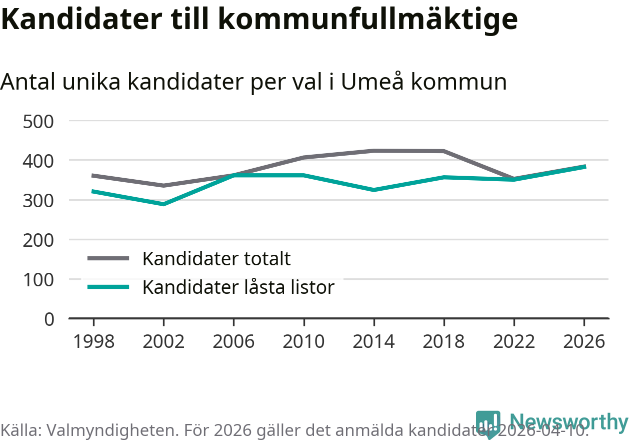 På torsdagen var det deadline för partier med låsta listor att registrera sina kandidater inför höstens val. Till valet till kommunfullmäktige i Umeå är 382 kandidater anmälda på sådana listor, vilket är 32 fler än i valet 2022. Det är den högsta siffran sedan åtminstone valet 1998, vilket är så långt tillbaka som vi har statistik för.